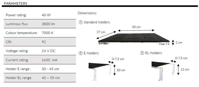 Como estándar, la lámpara viene con patas “S”, la lámpara también puede estar equipada con patas “E” o “EL” para aumentar la altura sobre el terrario y mejorar la mezcla.